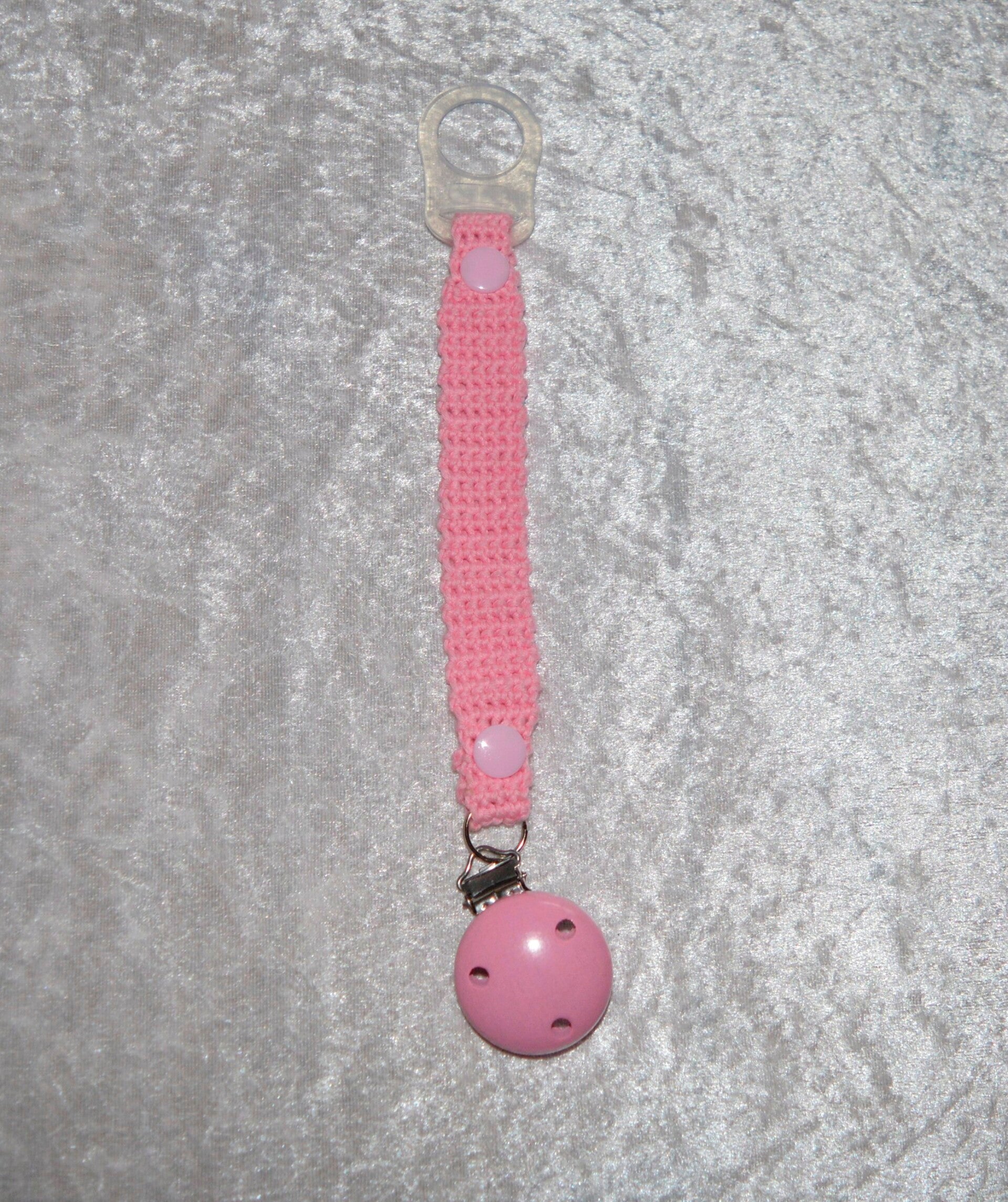Der Schnullerhalter besteht aus einen Clip zur Befestigung, einem gehäkeltem Band sowie aus Druckknöpfen & einem Silikonring.