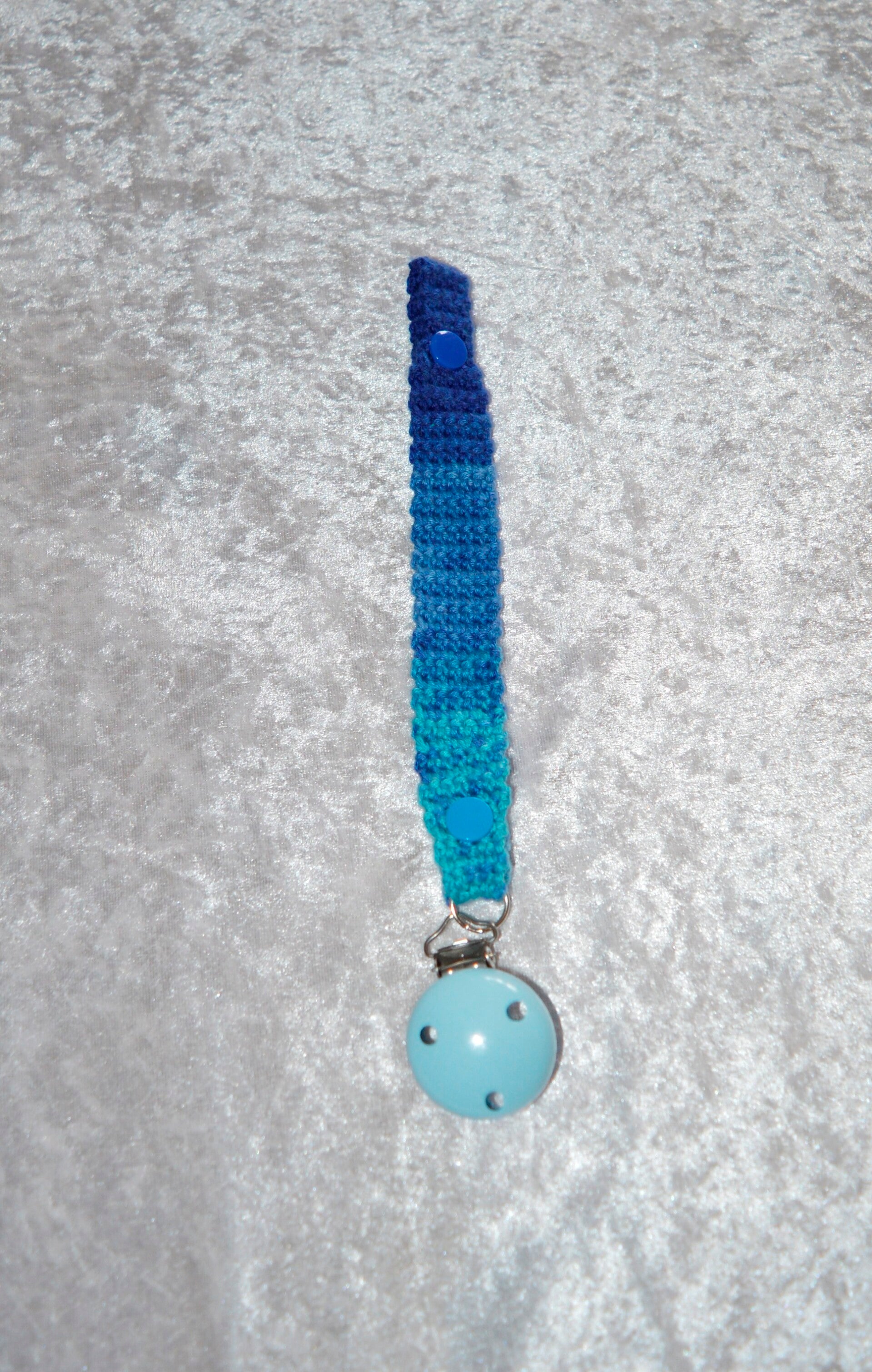 Der Schnullerhalter besteht aus einen Clip zur Befestigung, einem gehäkeltem Band sowie aus Druckknöpfen.