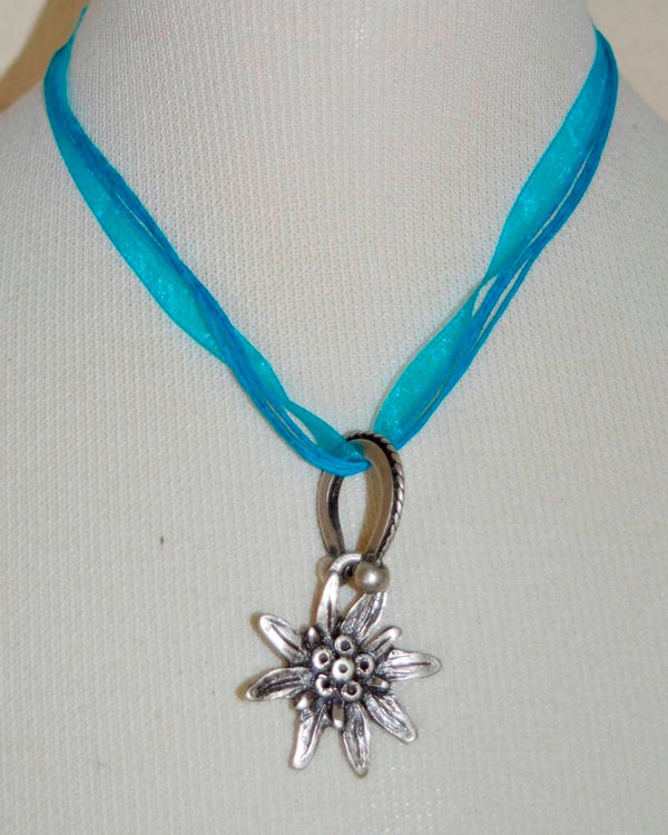 Schöne Trachten-Kette, Dirndl-Kette mit Hufeisen/Edelweiß-Anhänger mit einem Halsband aus Organza und Baumwolle.