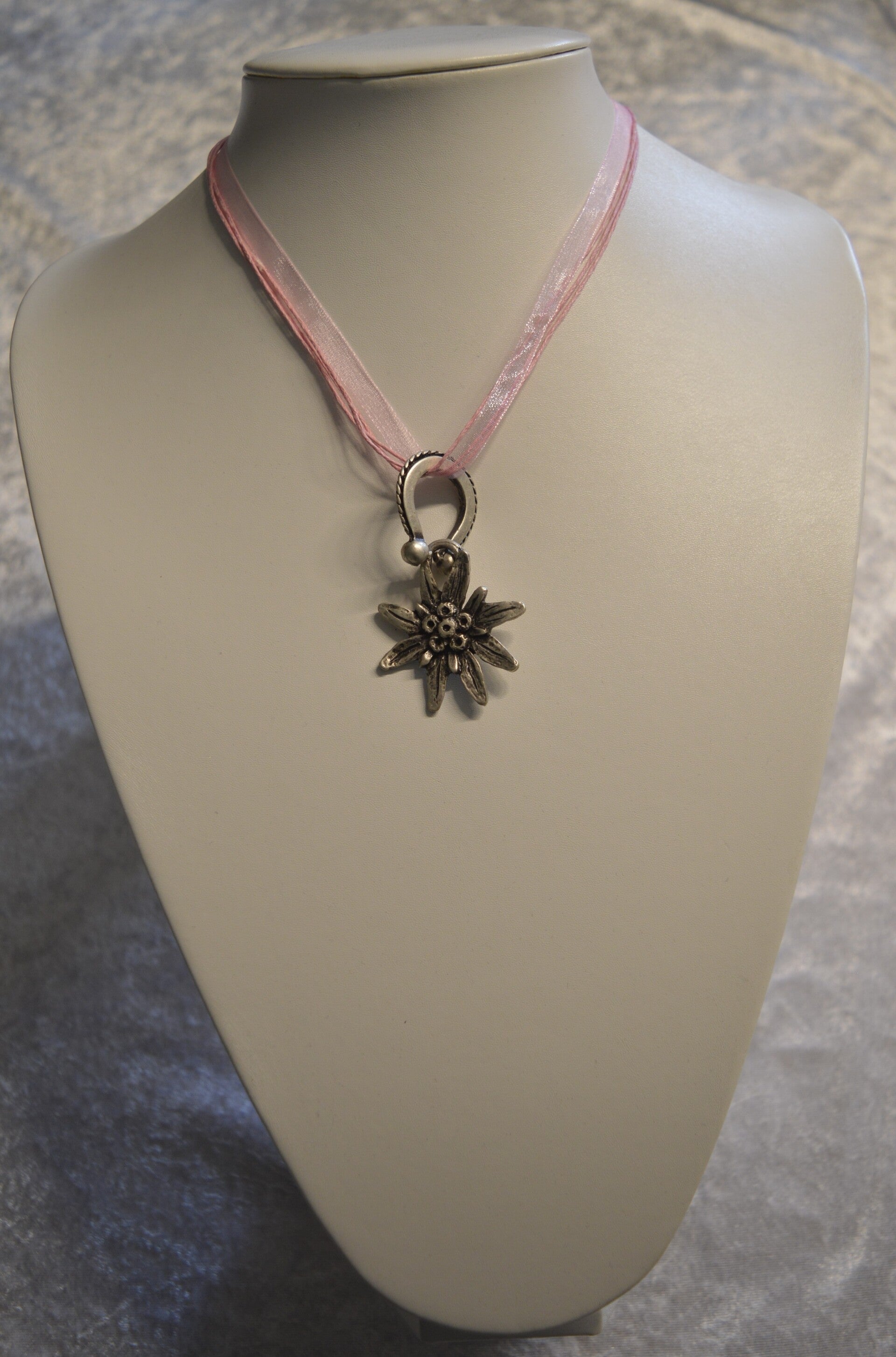 Schöne Trachten-Kette, Dirndl-Kette mit Hufeisen/Edelweiß-Anhänger mit einem Halsband aus Organza und Baumwolle.