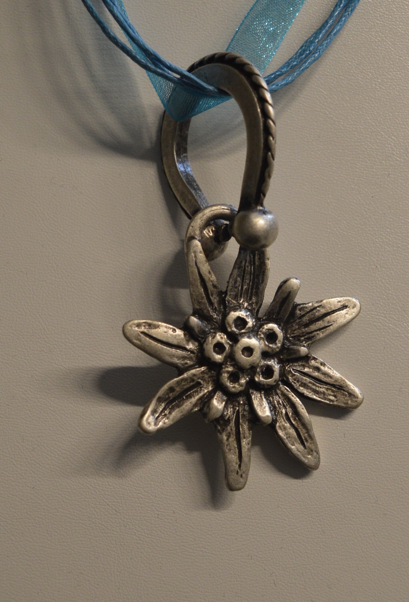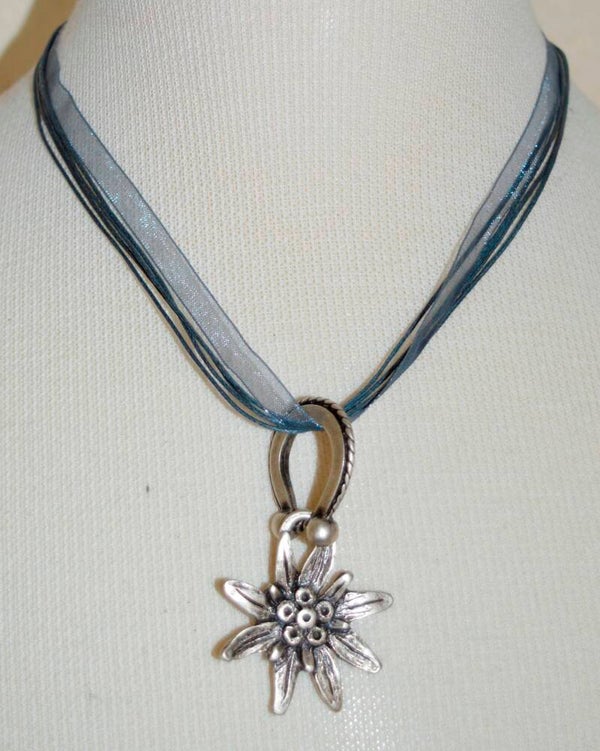 Schöne Trachten-Kette, Dirndl-Kette mit Hufeisen/Edelweiß-Anhänger mit einem Halsband aus Organza und Baumwolle.