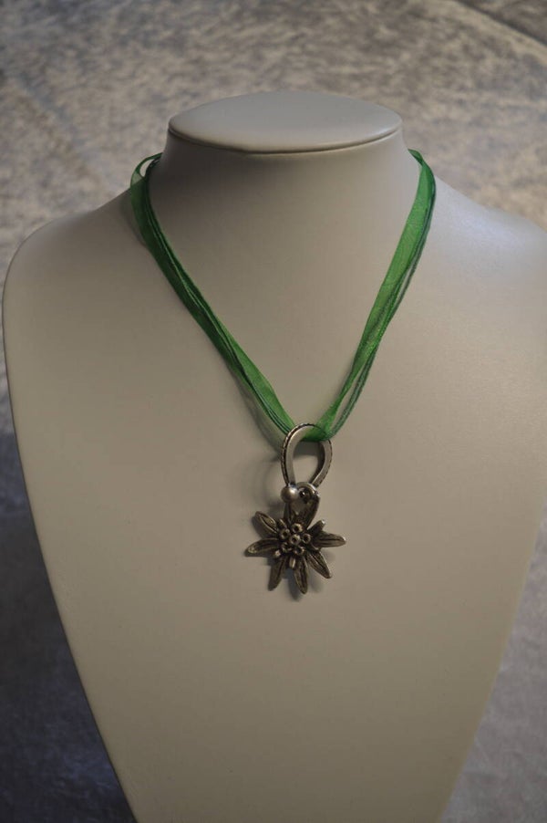 Schöne Trachten-Kette, Dirndl-Kette mit Hufeisen/Edelweiß-Anhänger mit einem Halsband aus Organza und Baumwolle.